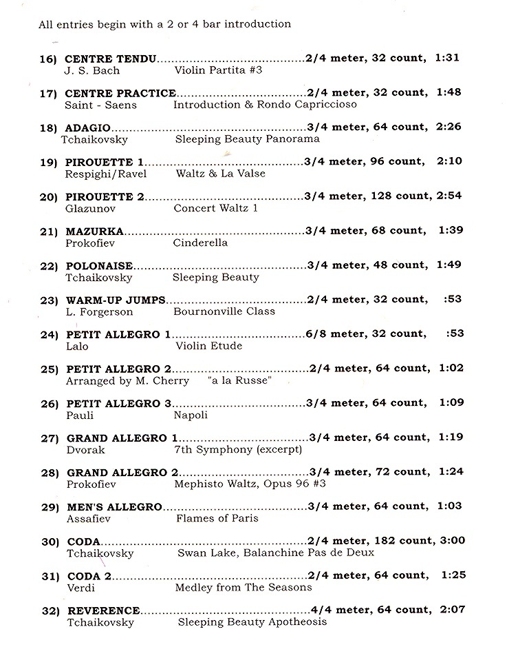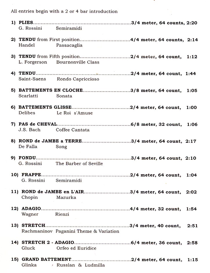 ●内容:セビリアの理髪師、シンデレラ、眠りの森の美女、ナポリ、パリの炎などバレエのの曲とクラシックをアレンジした曲で構成されています。音も取りやすいのでどのレベルのクラスでもお使い頂けます。